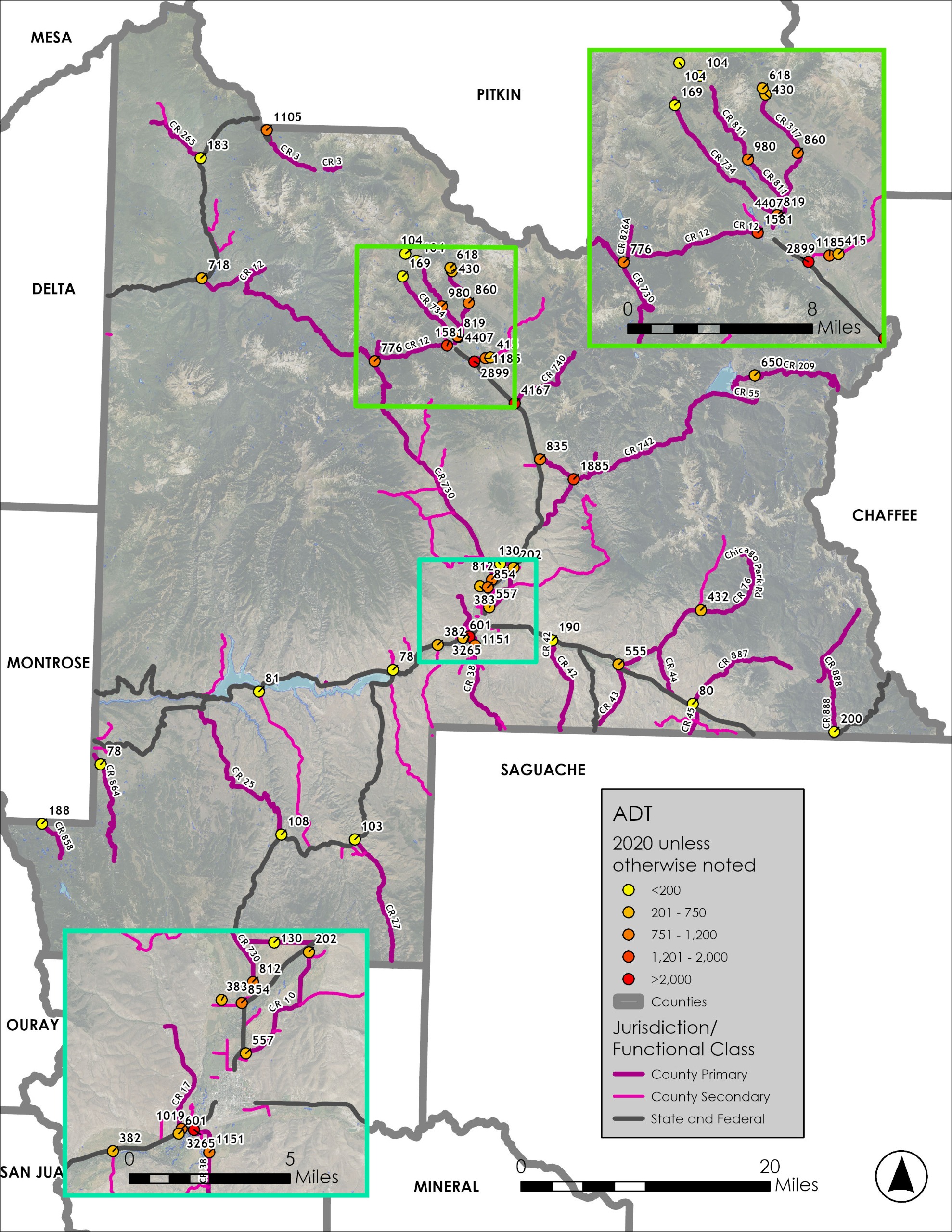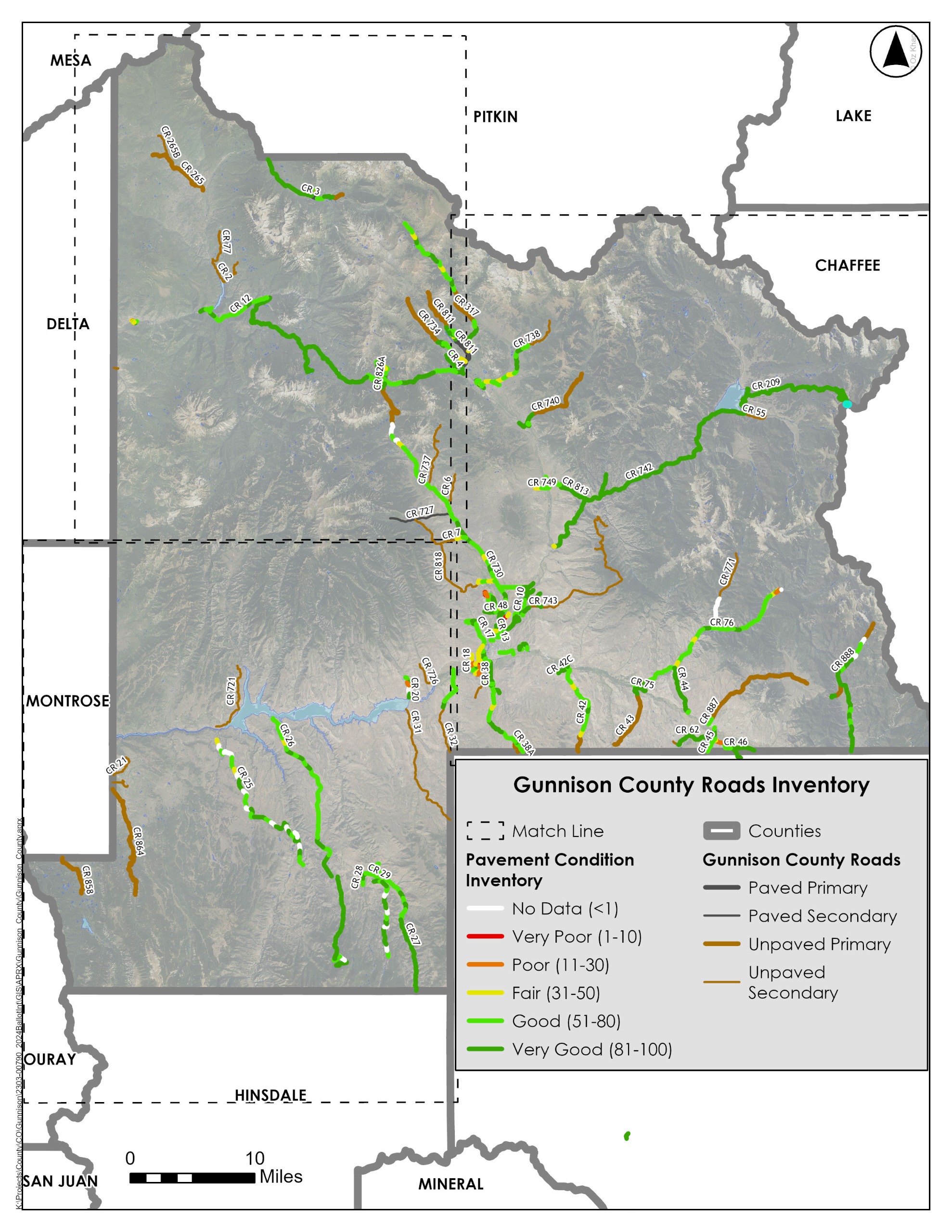 Gunnison County recently completed a thorough pavement conditions assessment of paved and gravel roads within the jurisdiction to gain an understanding of existing conditions and future surface transportation needs. This assessment also helped the County to identify budgetary needs to catch up on deferred maintenance and to continue to maintain and improve roads within Gunnison County, projecting out to the year 2045.