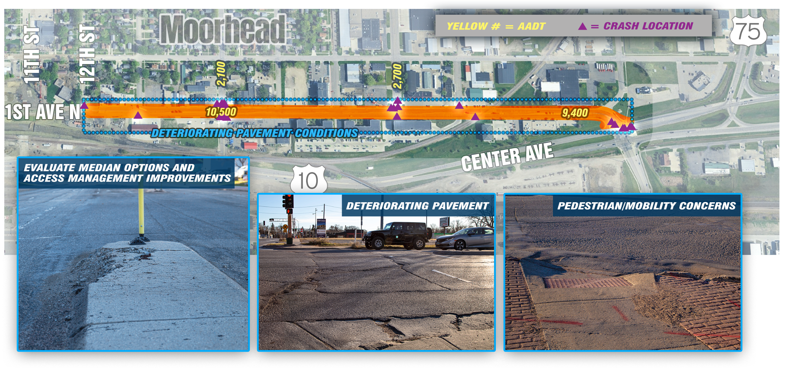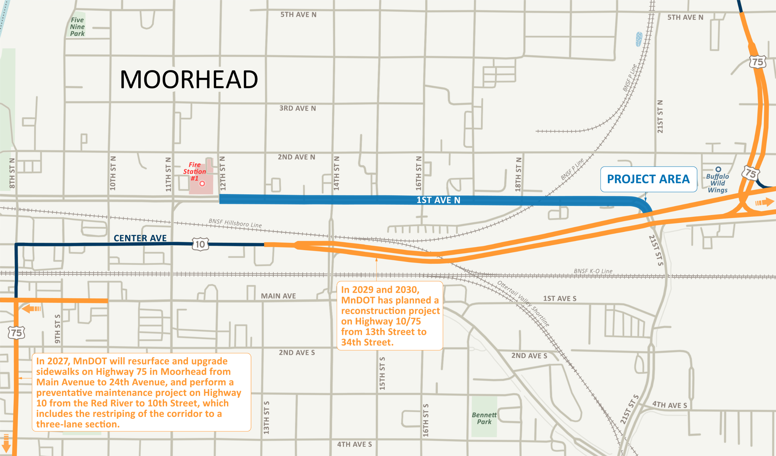 - MnDOT is planning to reconstruct Highway 10/ Highway 75 (Center Avenue) from 13th Street through 34th Street in 2029 and 2030.